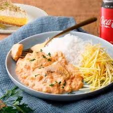 Delicioso estrogonofe de frango... Acompanhando de arroz saboroso e soltinho e batata palha especial..com coca cola 200ml e estrogonofe de Bis gratis