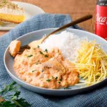 Delicioso estrogonofe de frango... Acompanhando de arroz saboroso e soltinho e batata palha especial + coca cola 200ml e um estrogonofe de Bis.