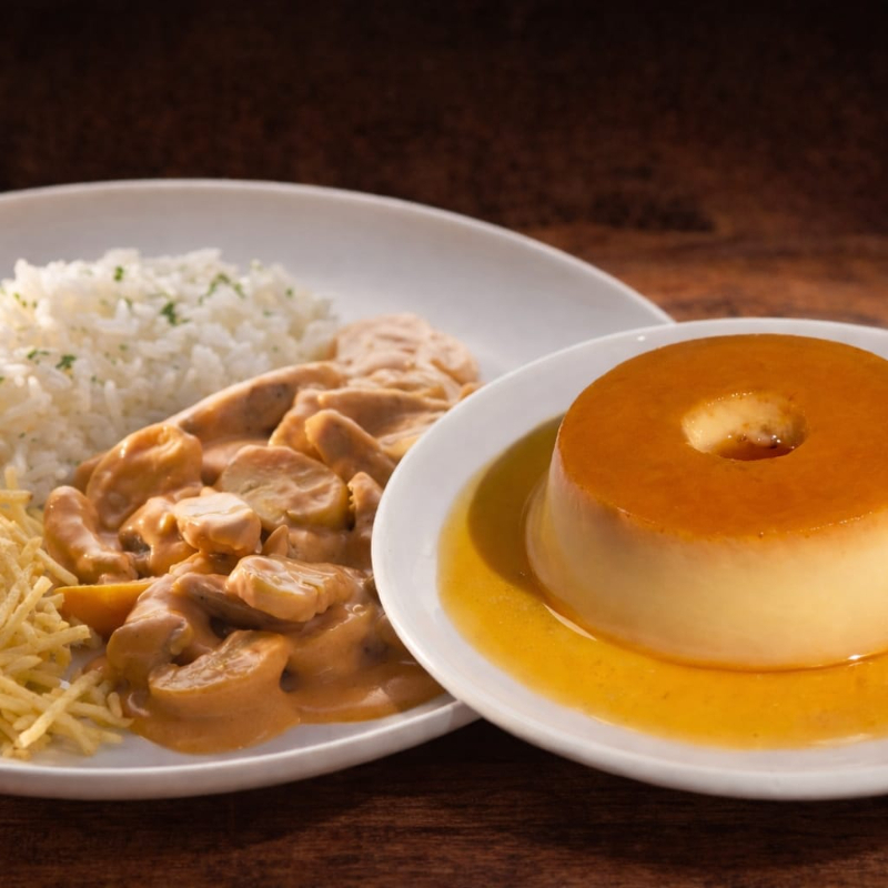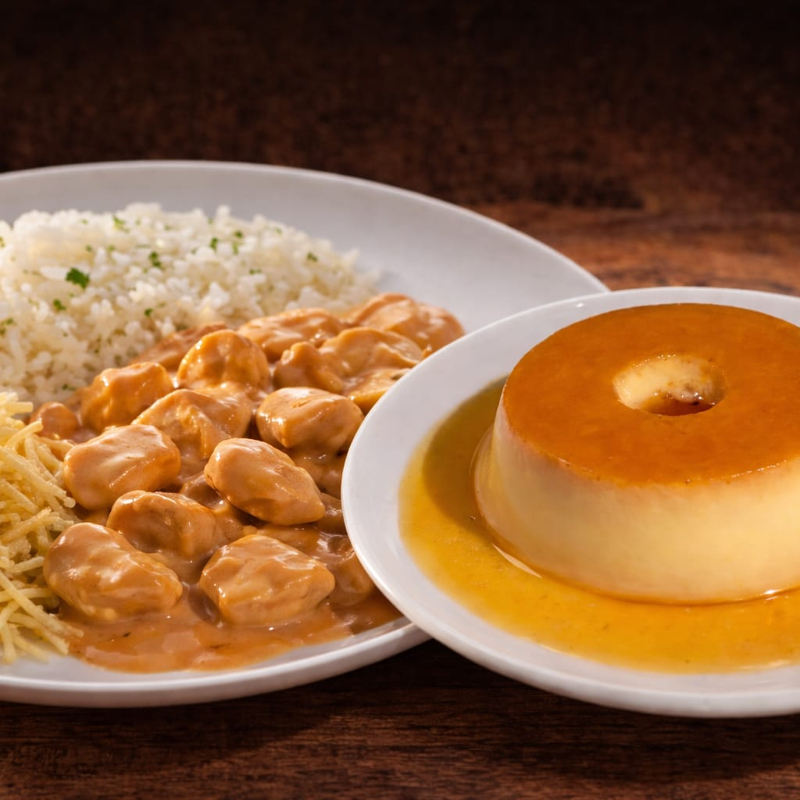 Delicioso estrogonofe de frango (400gr), acompanhado de arroz e batata palha