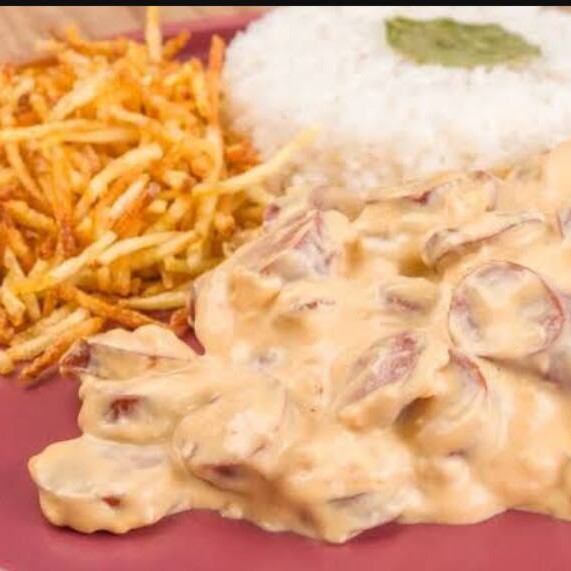 Delicioso estrogonofe de calabresa...e acompanha arroz e batata palha...