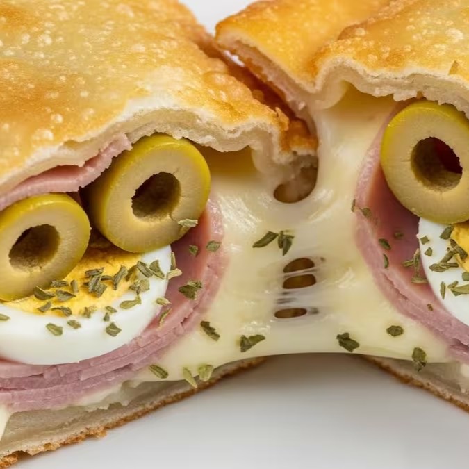 Delicioso pastel com massa crocante recheado com muçarela, presunto, ovo, azeitona e orégano.