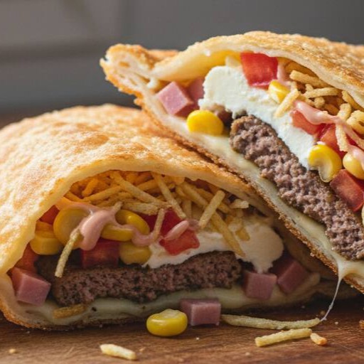 Deliciosa massa crocante recheada com queijo muçarela, presunto, hambúrguer, requeijão cremoso, molho 3 em 1, tomate, milho, batata palha.