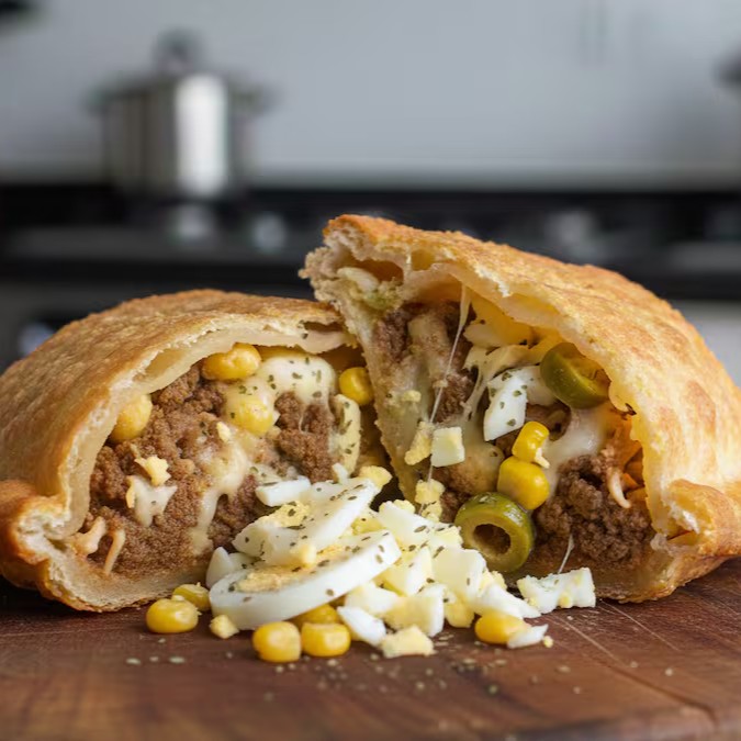 Saborosíssimo pastel de massa crocante, recheado de carne moída, peito de frango desfiado, queijo muçarela, ovo, requeijão cremoso, milho, azeitona e orégano.