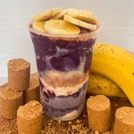 Uma explosão de sabores tropicais! A combinação perfeita de açaí cremoso, banana caramelizada na medida certa e a crocância da farofa crocante. Uma experiência única que vai conquistar seu paladar, com a doçura do caramelo e o toque especial dos nossos complementos. Irresistível!