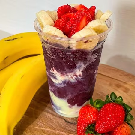 Açaí Banana Caramelizada, Farofa Crocante, Leite Em Pó E Leite Condensado.