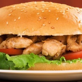 Pão com frango picado, queijo, presunto, alface, tomate, e batata frita