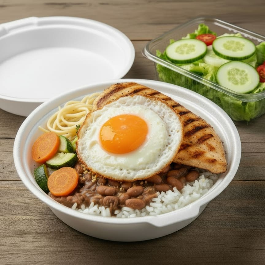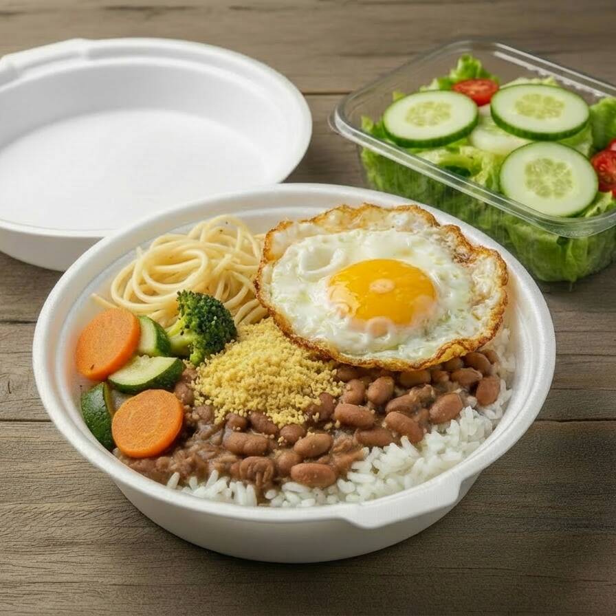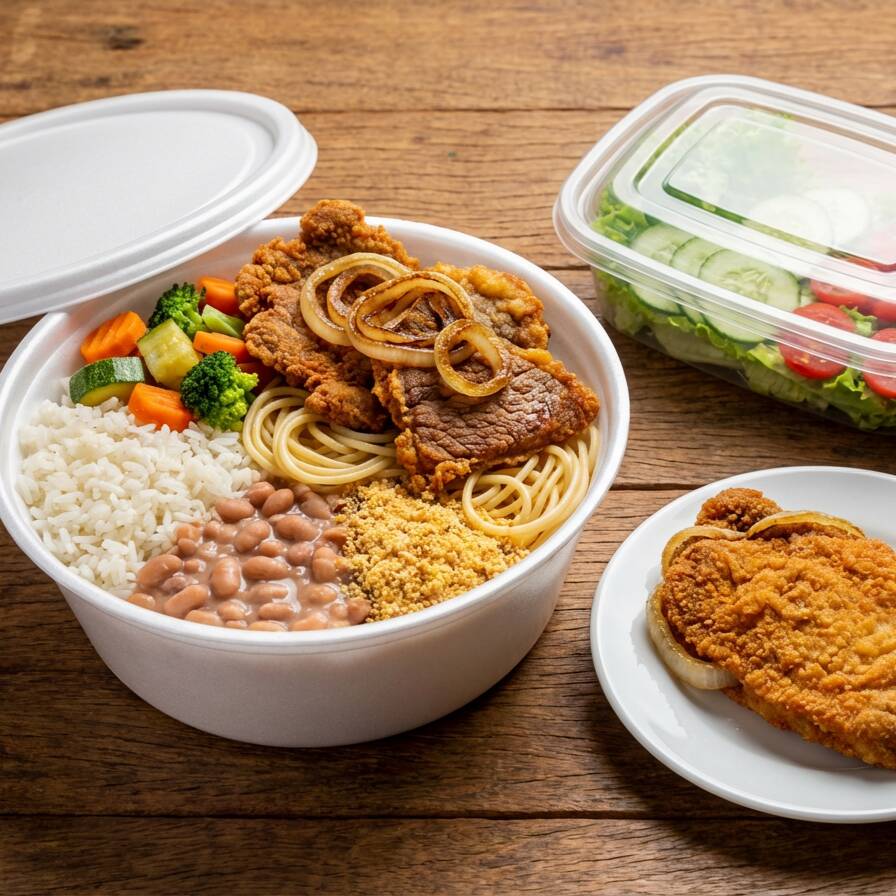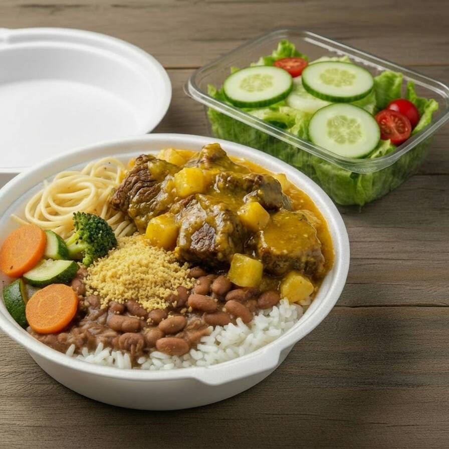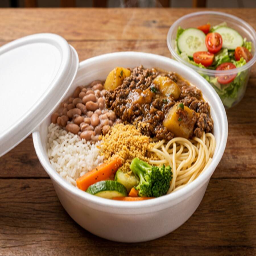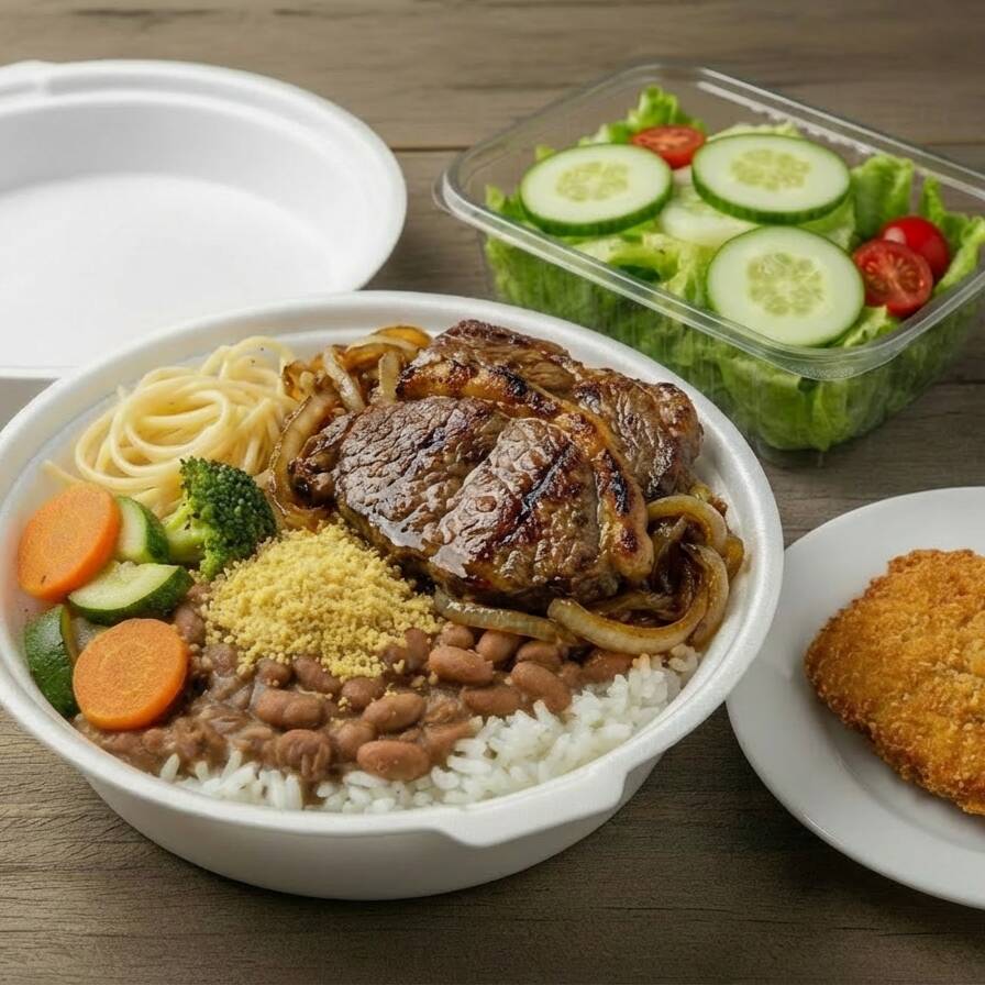 'Marmitex Tamanho Médio com 2 Opções de Carnes'. Esta refeição amplamente satisfatória é acompanhada por uma base de arroz e feijão, dando a você a liberdade de escolher entre o saboroso feijão branco ou o robusto feijão preto. Além disso, a oferta inclui macarrão suavemente cozido e legumes gratinados em variedades ricas para despertar o seu paladar. A farofa, temperada com bacon, acrescenta um toque especial. Para completar, uma salada fresca e vibrante é servida opcionalmente. Escolha suas 2 opções preferidas de carne para personalizar esta refeição ao seu gosto.
