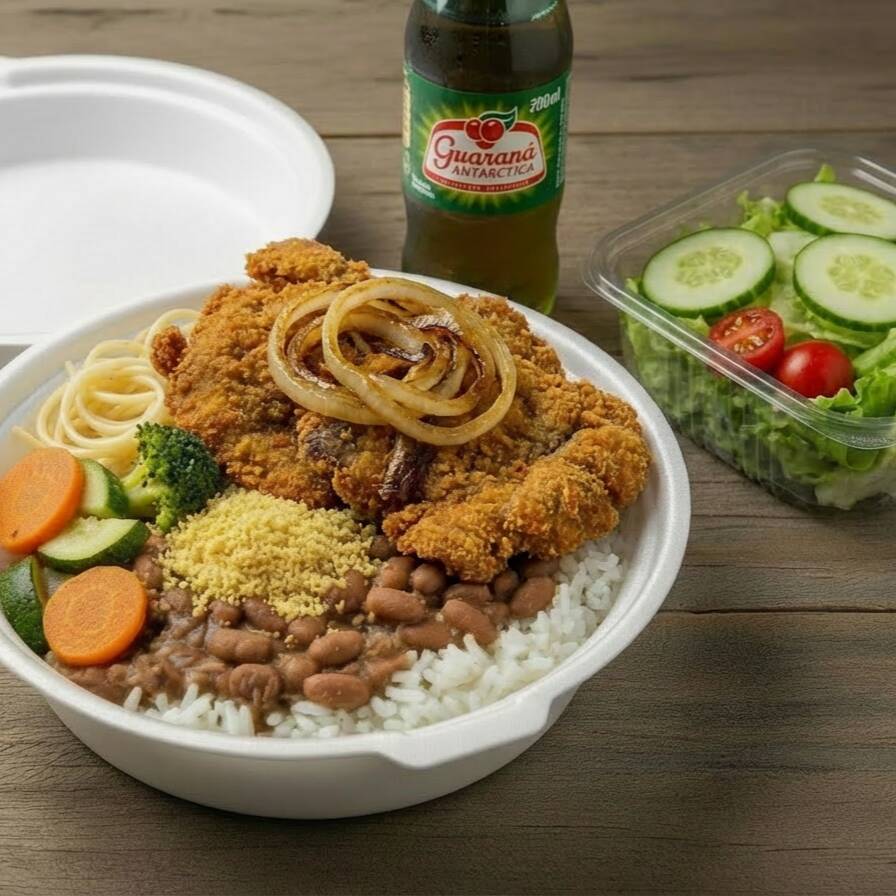 Os acompanhamentos são arroz , feijão branco ou feijão preto, macarrão, farofa temperada legumes gratinados e salada Opcional. 1 opção de carne 1 refrigerante lata