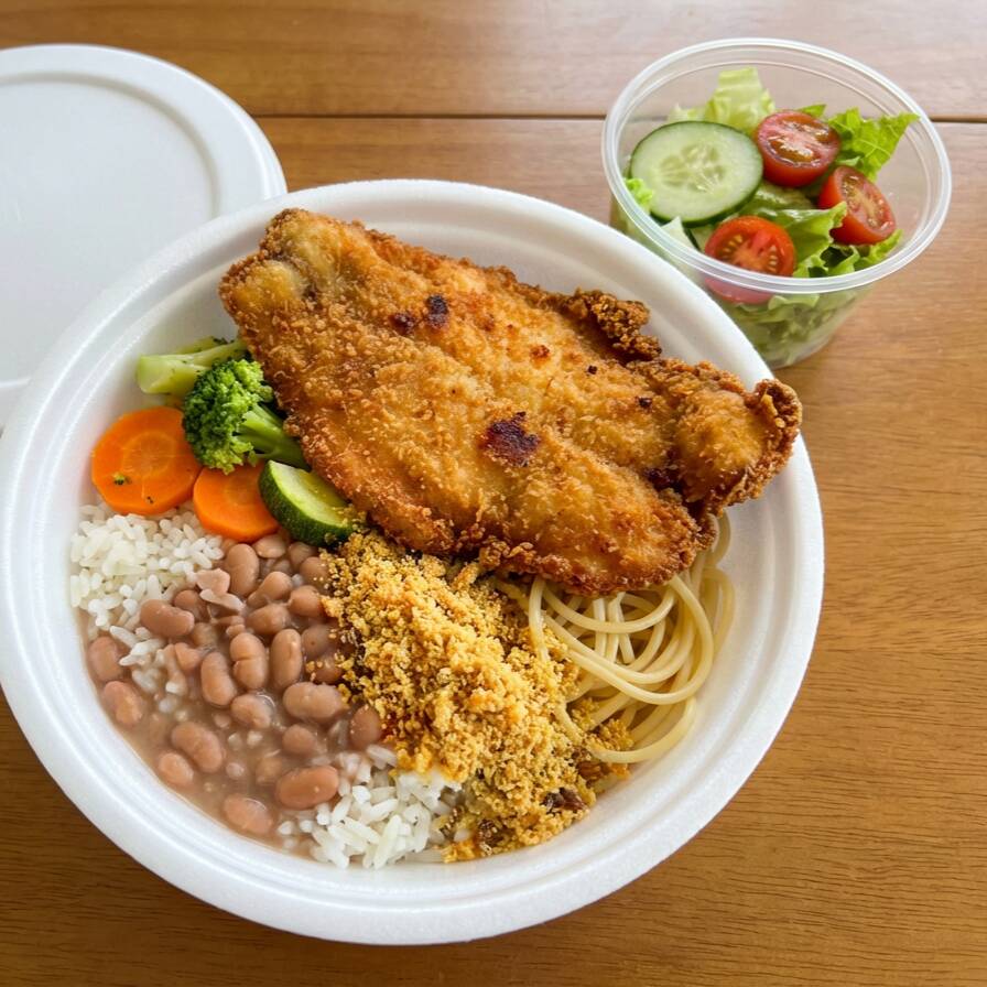 Acompanhado de arroz soltinho, feijão no ponto, macarrão irresistível, legumes gratinados douradinhos, farofa caseira temperada e uma salada fresca que dá o toque final.