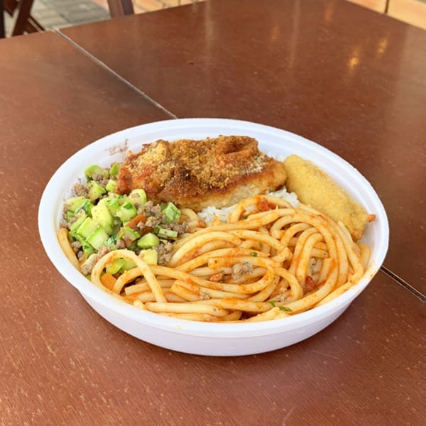 Arroz, Feijão, Fango empanado, Farofa, Batata frita e Salada.
