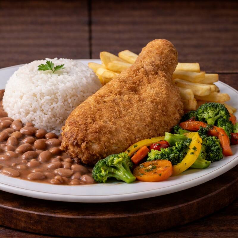 Acompanha: Arroz, Feijão temperado, Macarrão,Legumes selecionados, Batata frita crocante, salada e farofa da casa.