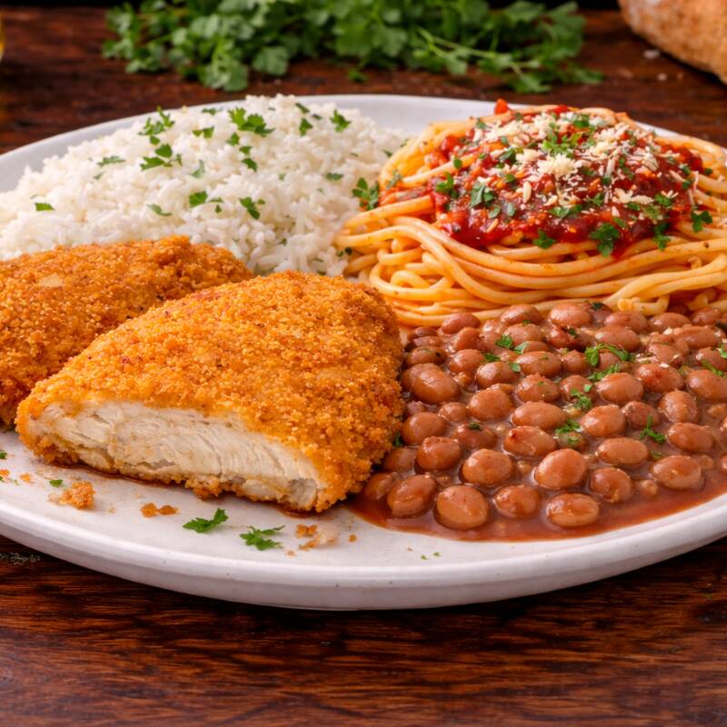 Frango Á Milanesa Crocante +arroz +feijão+macarrão "marmita"