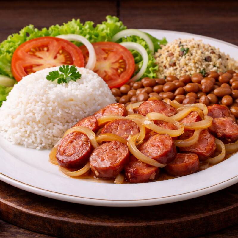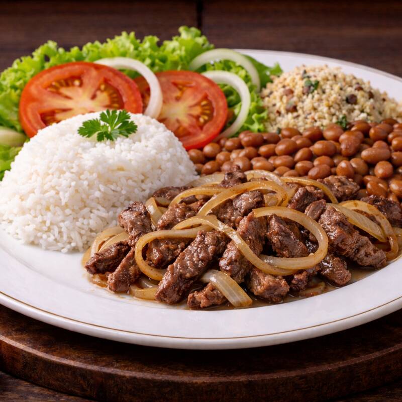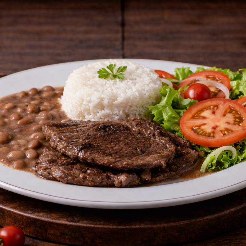 Bife acebolado suculento, acompanhado de arroz, feijão temperado, macarrão, legumes fresquinhos, batata frita crocante, farofa da casa e uma salada refrescante. Preparada com muito carinho para você!