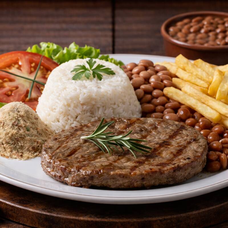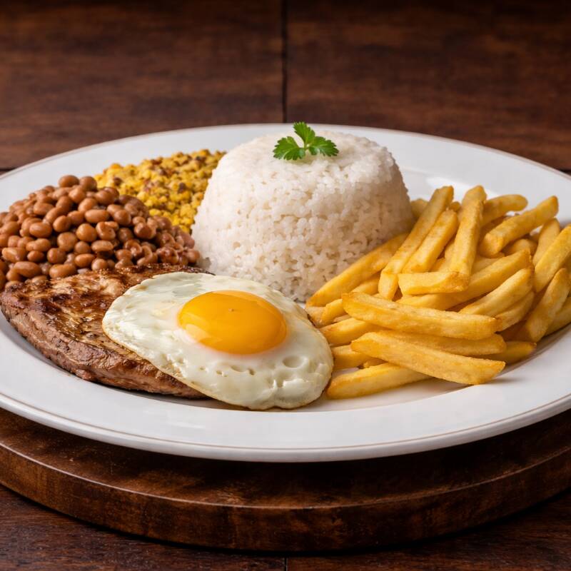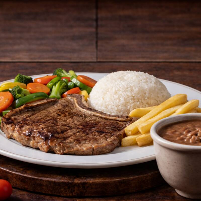 Bife suculento a cavalo, acompanhado de arroz fresquinho, feijão temperado, macarrão, legumes selecionados, batata frita crocante, farofa da casa e uma salada fresquinha para completar. Sabor e qualidade em cada mordida!