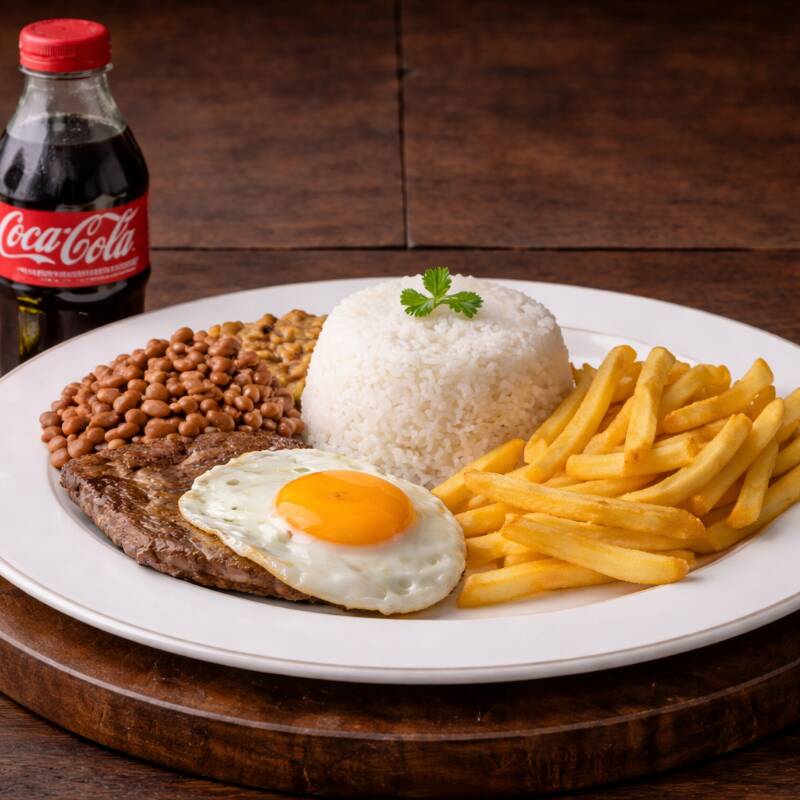 Bife suculento a cavalo, acompanhado de arroz fresquinho, feijão temperado, macarrão, legumes selecionados, batata frita crocante, farofa da casa e uma salada fresquinha para completar uma Coca-Cola gelada 200ml Grátis. Sabor e qualidade em cada mordida!