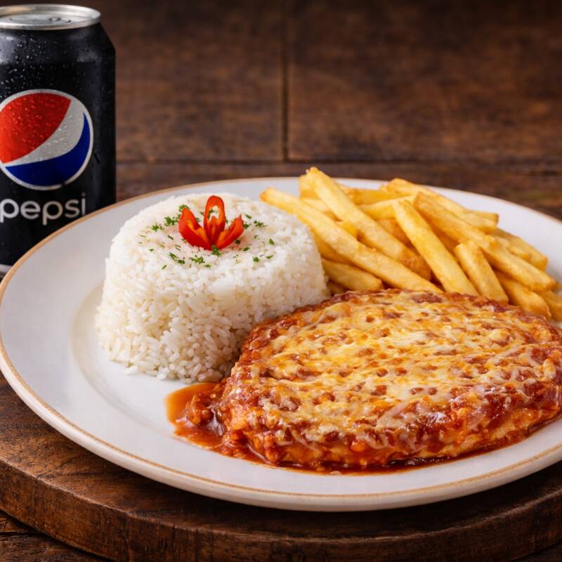Parmegiana de carne de alcatra deliciosa acompanhada de uma coca de 200 ml gelada+ batata frita crocante, arroz branco bem soltinho.