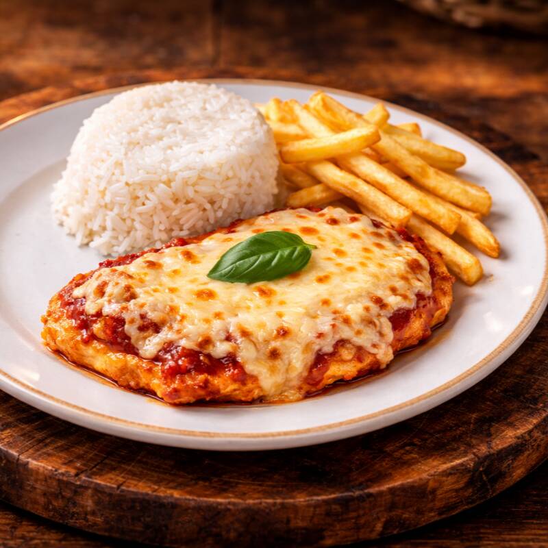 Parmegiana de alcatra com molho especial e queijo gratinado, acompanhado de batata frita crocante . Sabor e qualidade em cada pedaço!
