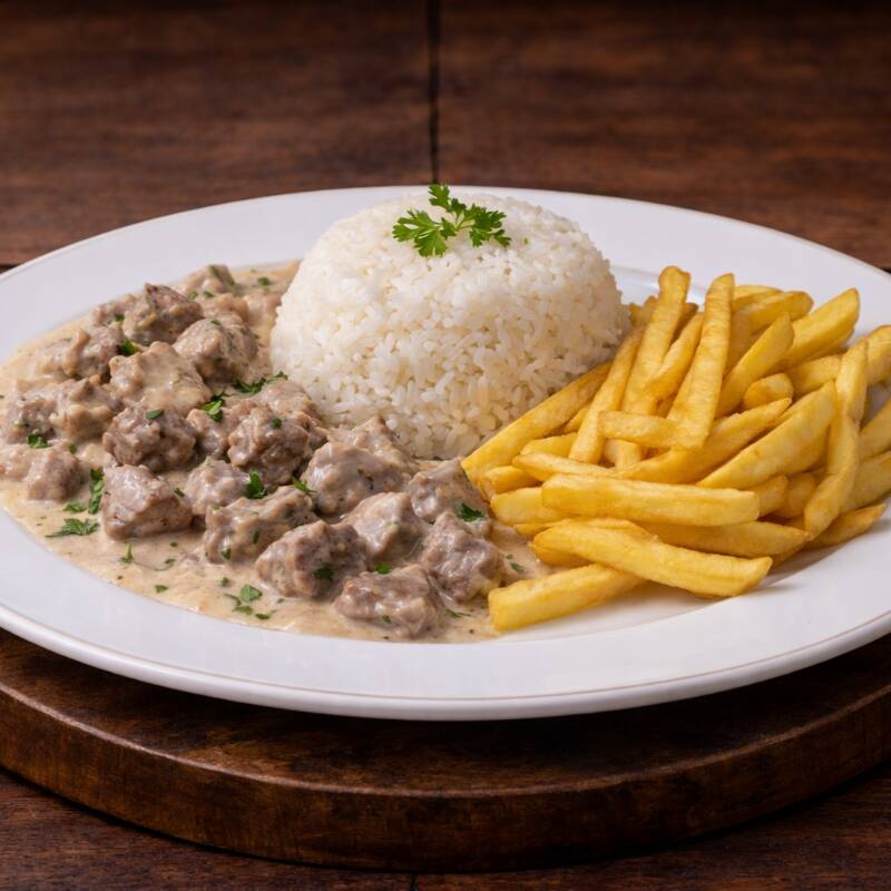 Cubos de carne em um delicioso molho de estrogonofe, servidos com arroz e batata palha.