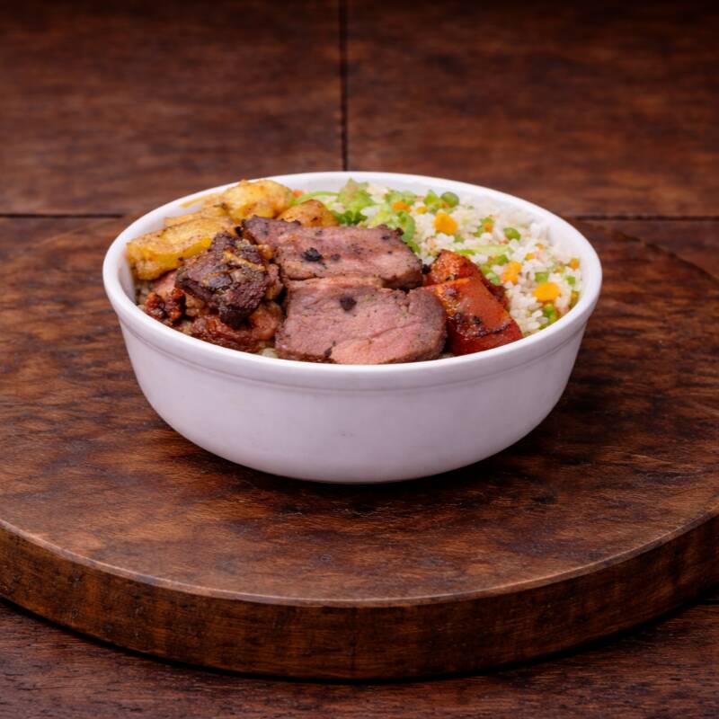 Bisteca carne de porco Acompanha: Arroz, Feijão temperado, Macarrão, Legumes selecionados, Batata frita crocante, salada e farofa da casa.