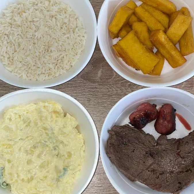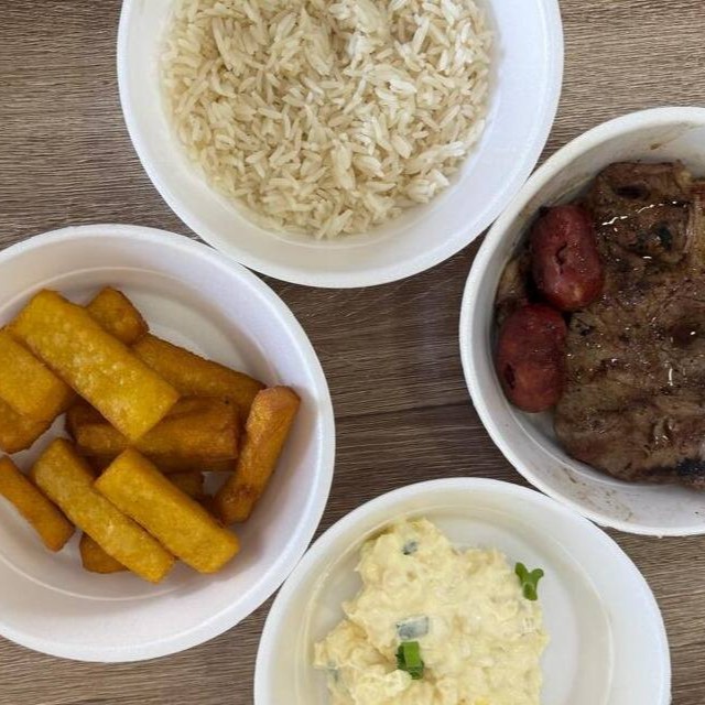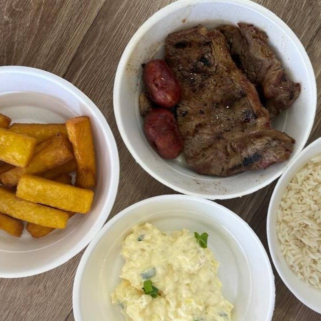 Carne, arroz branco, farofa especial, maionese, polenta frita e 2 linguiças toscana