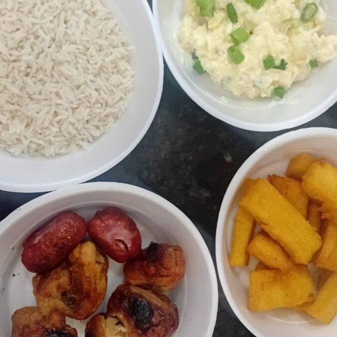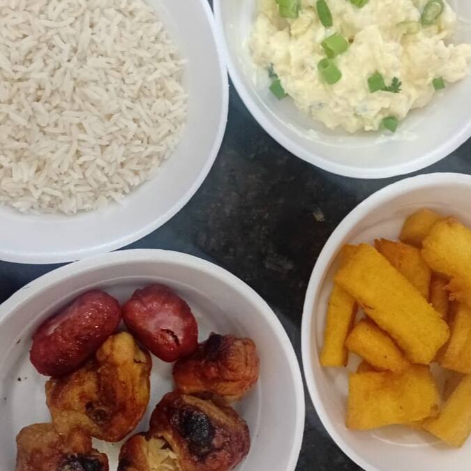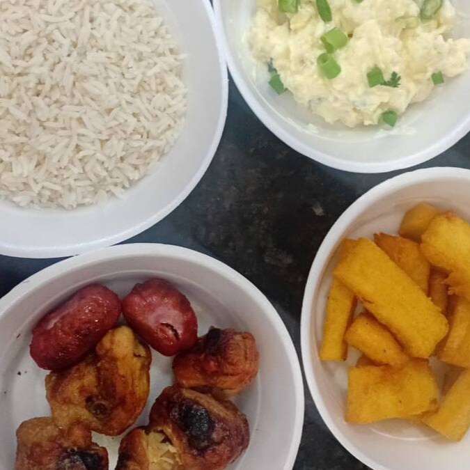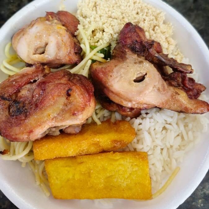 Frango, arroz, farofa especial, maionese, polenta e 2 linguiças toscana