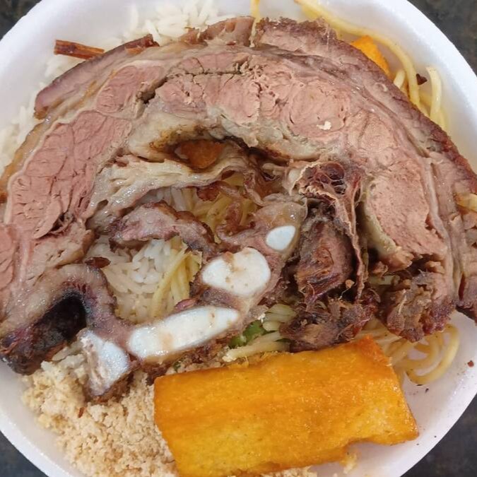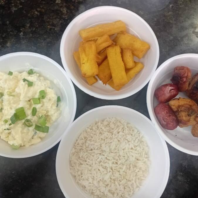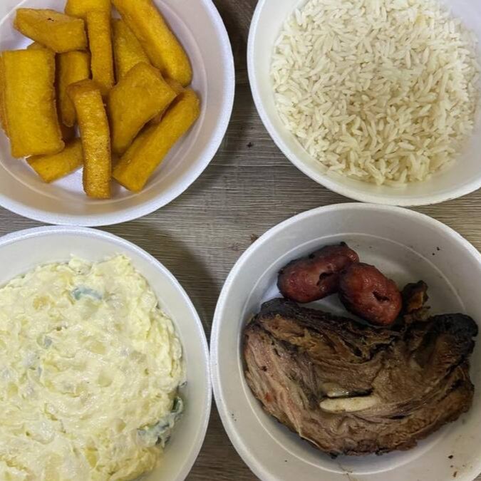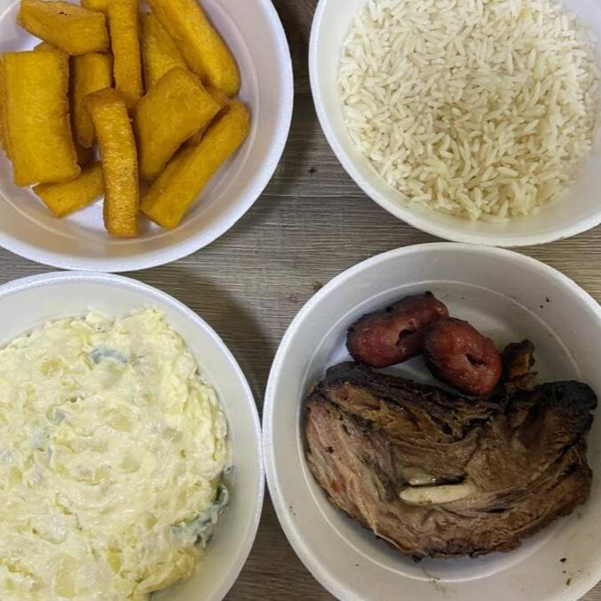 Costela, arroz branco, farofa especial, maionese, polenta frita e 2 linguiças toscana
