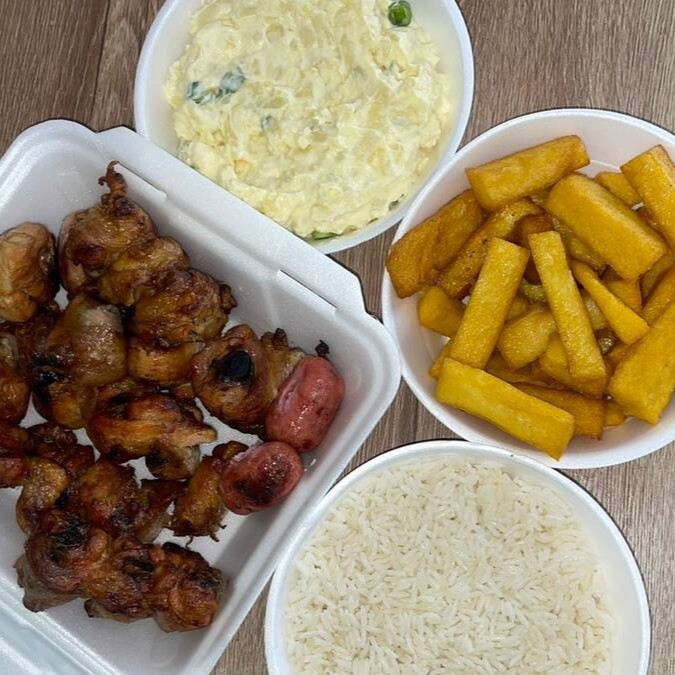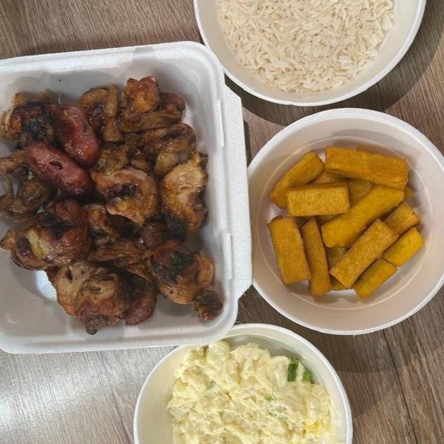 Pedaços de coxa e sobre-coxa (1kg), arroz branco, farofa especial,maionese, polenta frita e 2 linguiças toscana