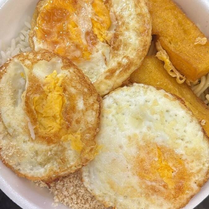 Arroz,feijao,macarrao,polenta,farofa e 3 ovos fritos