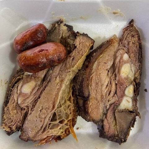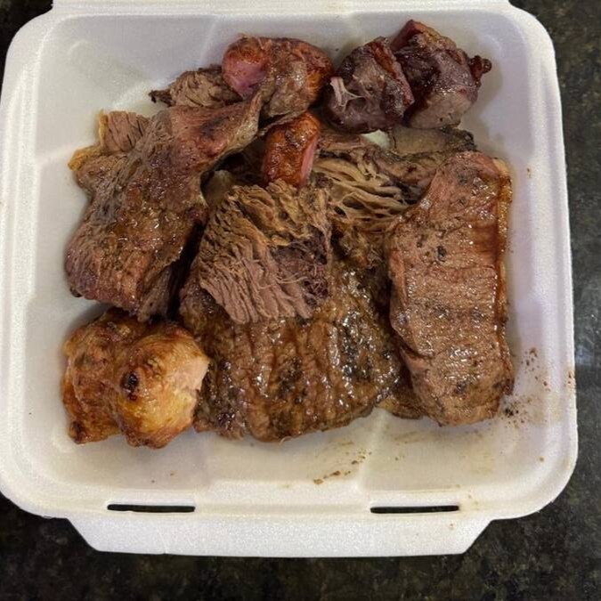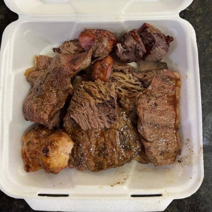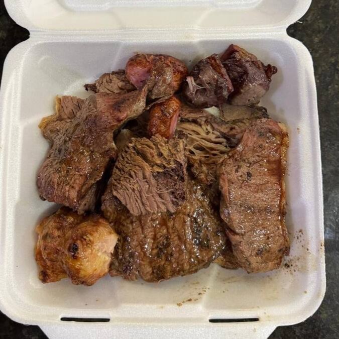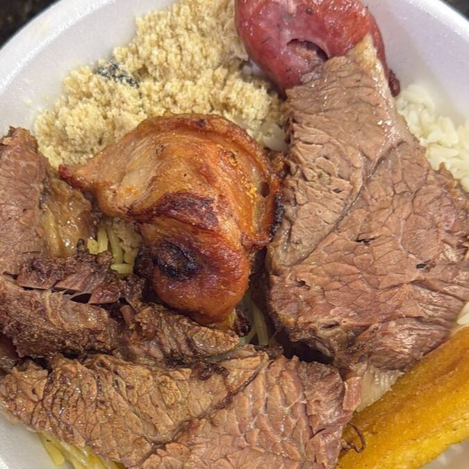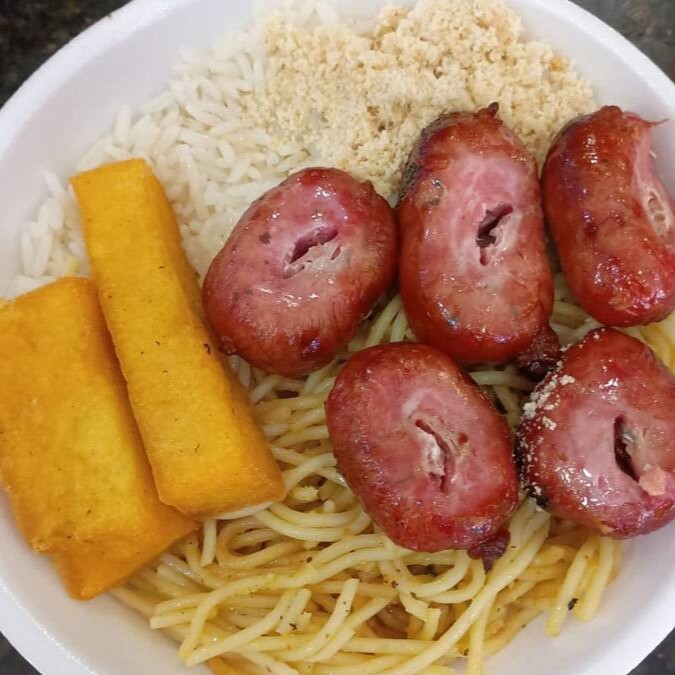 Carne, arroz, farofa especial, maionese, polenta e 2 linguiças toscana