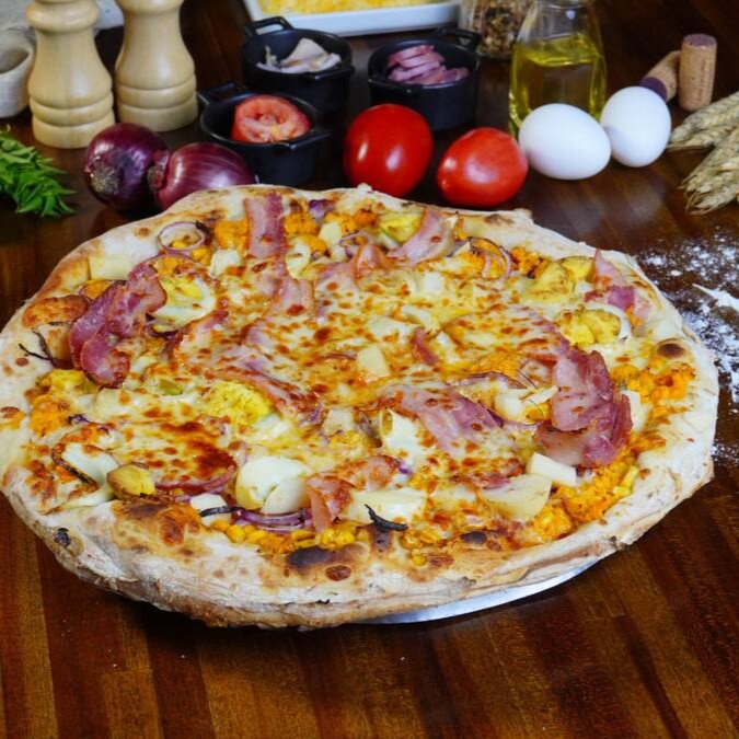 Massa de longa fermentação, molho de tomate, mozarela especial, lombo canadense fatiado, Requeijão Cremoso e orégano.