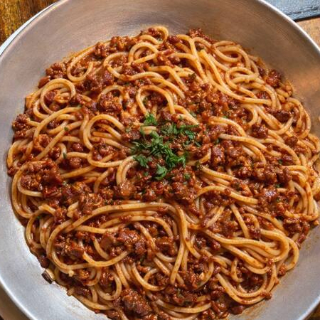 Spaghetti com molho bolonhesa artesanal, feito com carne e tomate selecionados. Um clássico saboroso e bem servido.