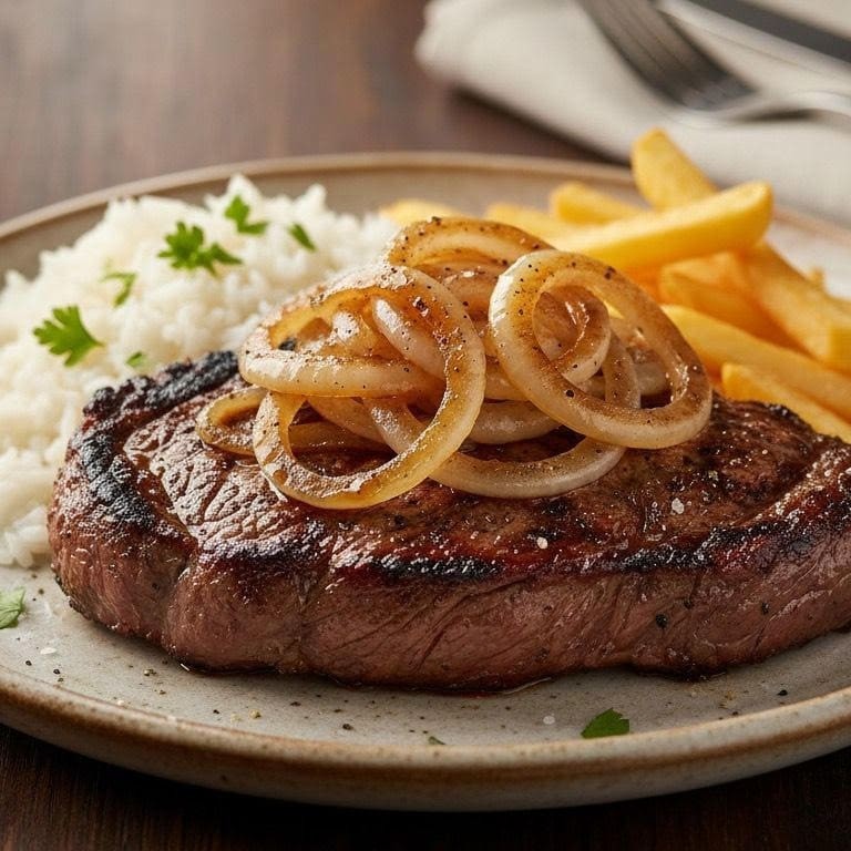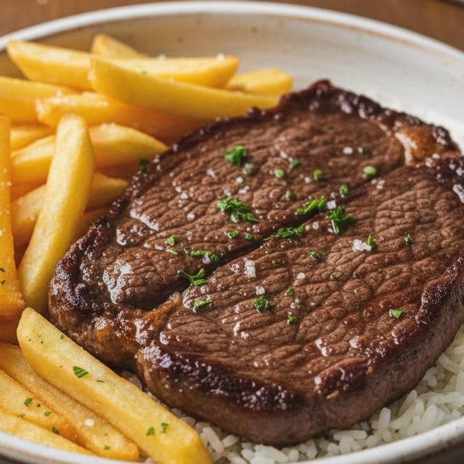 Arroz, feijão branco ou preto, macarrão do Dia, batata frita e bife grelhado com cebola.