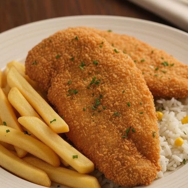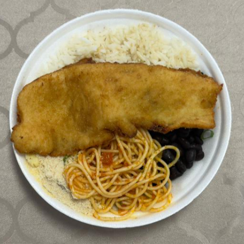 Arroz, feijão branco ou preto, macarrão do Dia, batata frita e peito de frango à milanesa