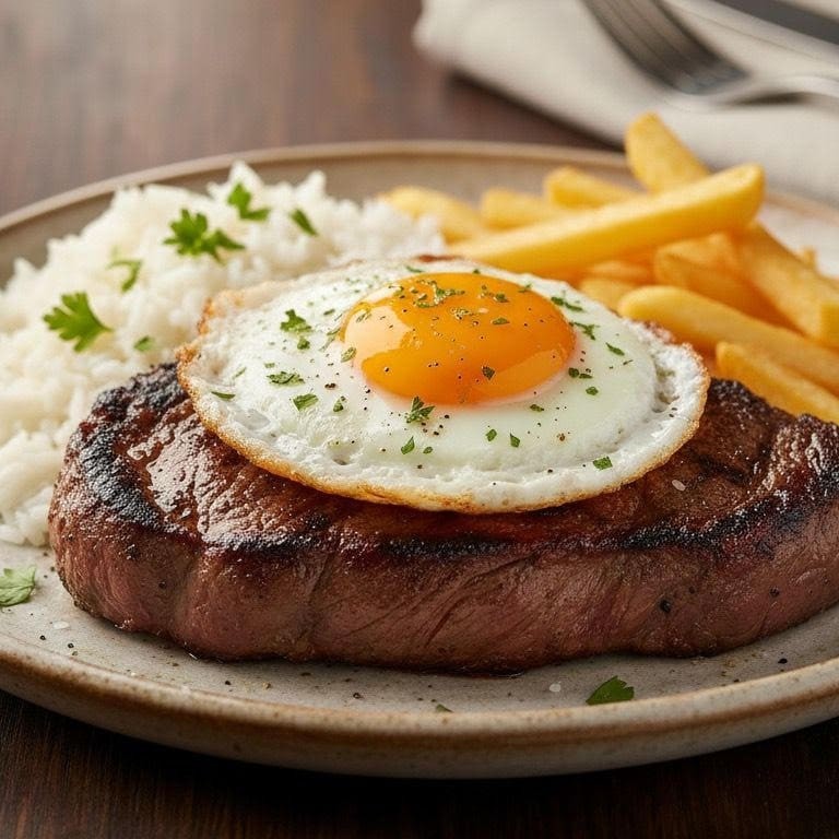 Arroz, feijão branco ou preto, macarrão do dia, batata frita e bife grelhado com ovo