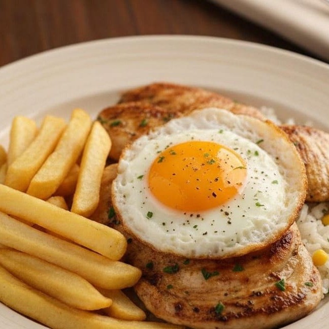 Arroz, feijão branco ou preto, macarrão do Dia, batata frita e peito de frango grelhado com ovo, acompanha salada do Dia.
