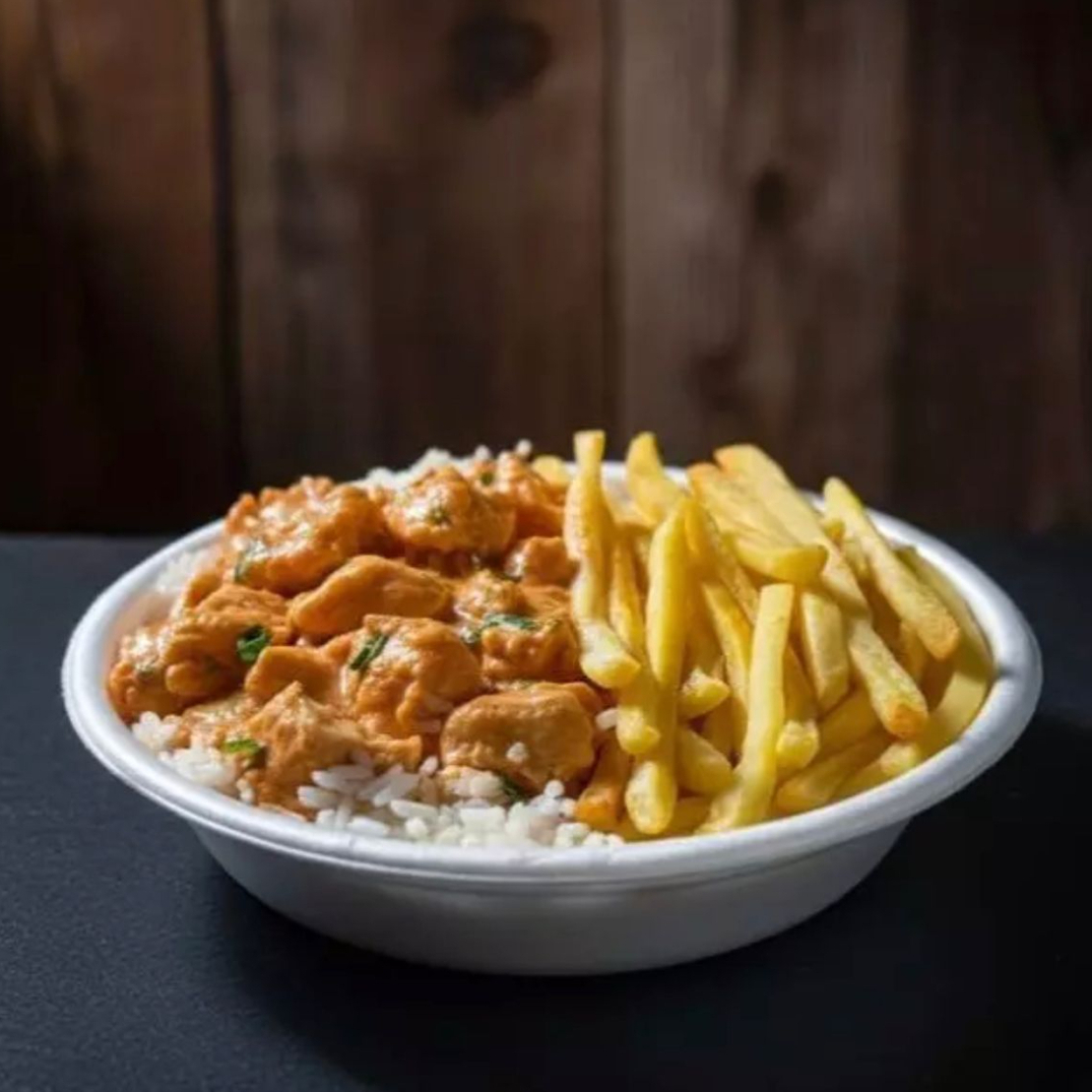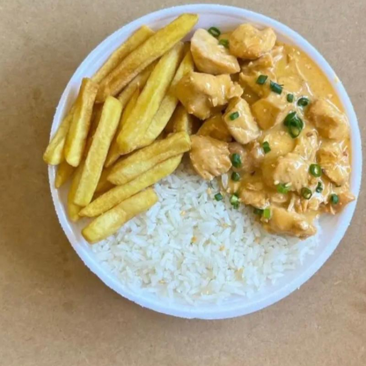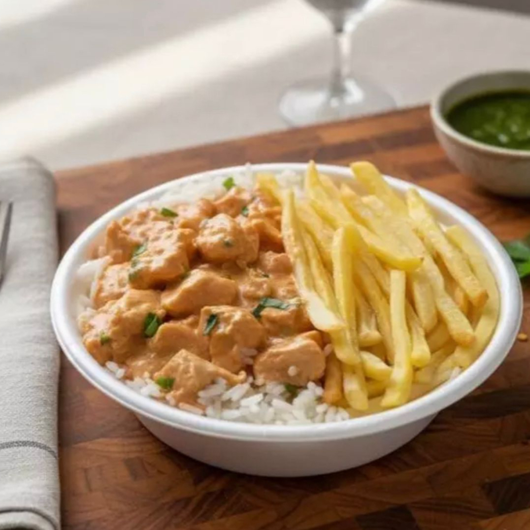 Marmita com delicioso filé de frango ao molho estrogonofe acompanhado de arroz branco e batatas fritas Marmita indicada para 01 pessoa. Peso aproximado 450-500gramas