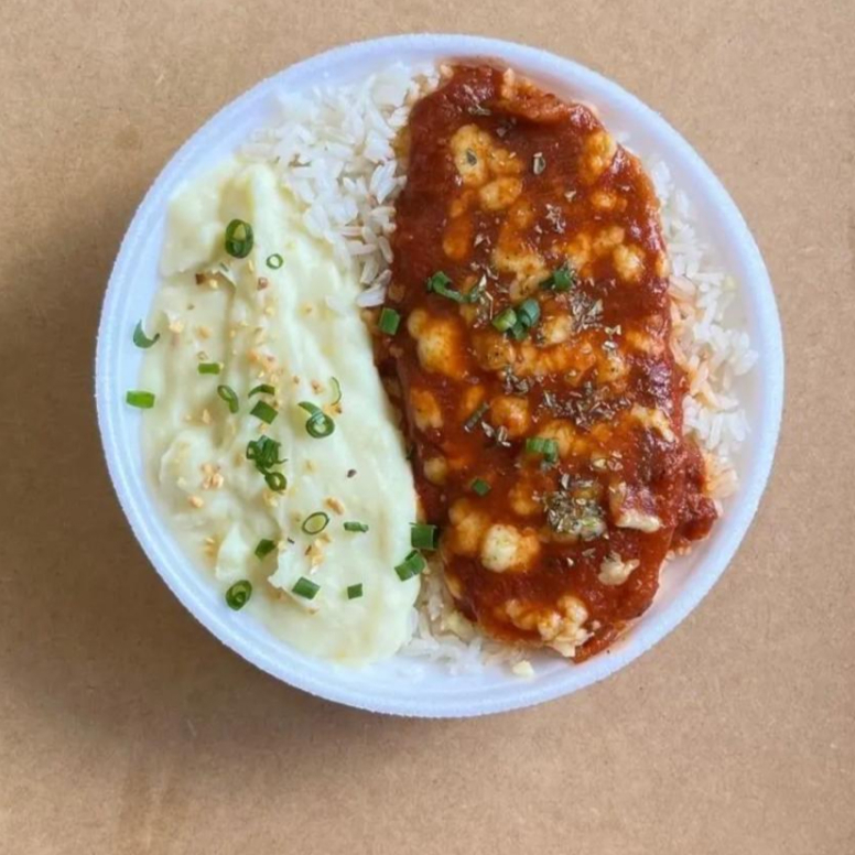 Marmita com delicioso filé de frango parmegiana (empanado na massa crocante coberto com molho de tomates e queijo) acompanhado de arroz branco e purê de batatas inglesas. Marmita indicada para 01 pessoa. Peso aproximado 450-500gramas.