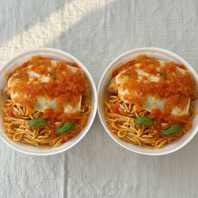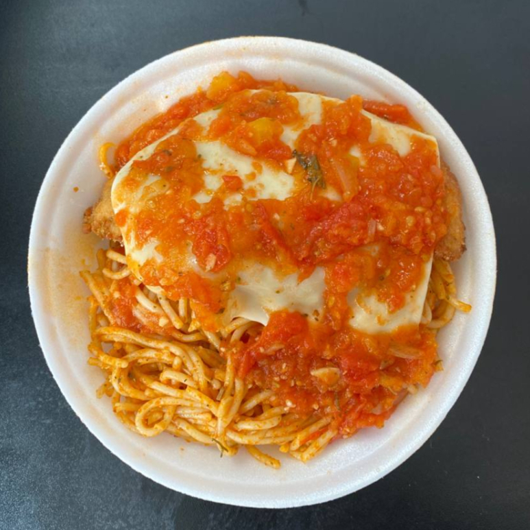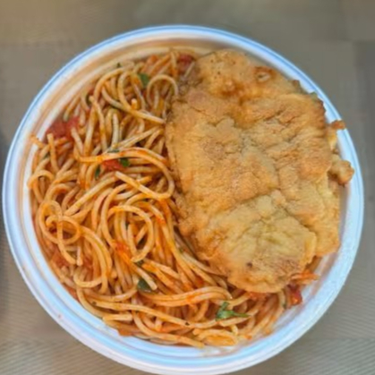 Marmita Pequena (550 M L) Composta por: Macarrão espaguete ao molho pomodoro e parmegiana de frango.