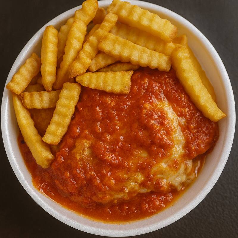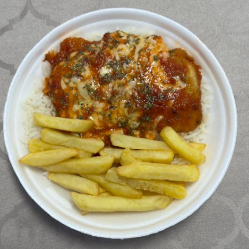 Marmita com delicioso filé de frango parmegiana (empanado na massa crocante coberto com molho de tomates e queijo) acompanhado de arroz branco e batatas fritas. Marmita indicada para 01 pessoa. Peso aproximado 450-500gramas.