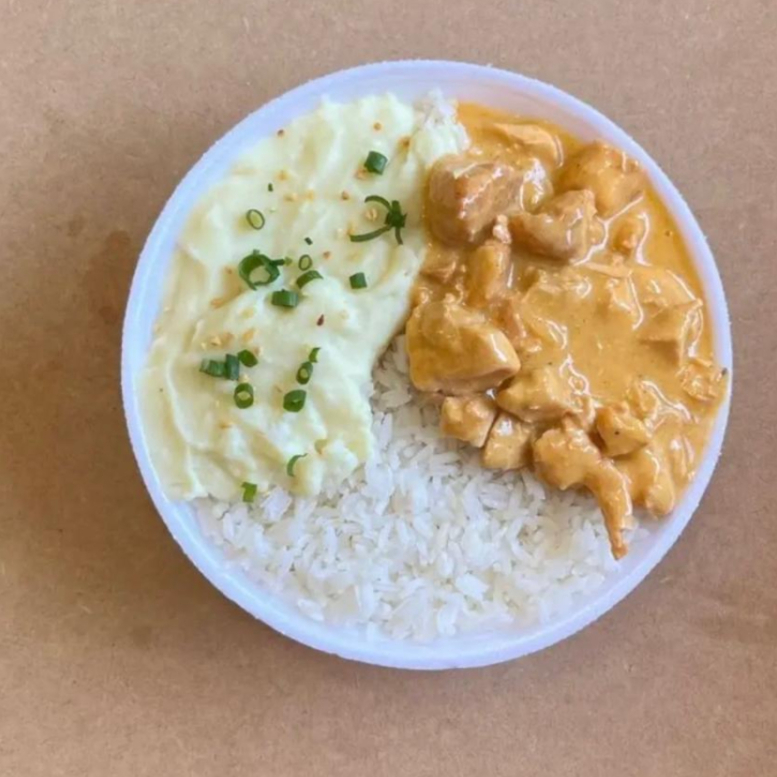Marmita com delicioso filé de frango ao molho estrogonofe acompanhado de arroz branco e purê de batatas inglesas. Marmita indicada para 01 pessoa.