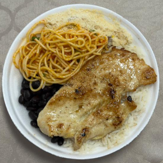 Arroz, feijão branco ou preto, macarrão do Dia, batata frita e peito de frango grelhado com cebola.