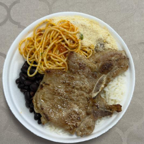 Marmita composta por: Bisteca Grelhada, arroz, feijão, macarrão e farofa. Peso aproximado: 450g