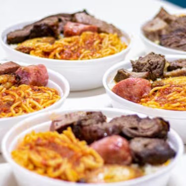 Arroz, feijão, macarrão e batata rústica, acompanhados de 3 cortes bovinos e 1 linguiça toscana, todos assados na brasa.