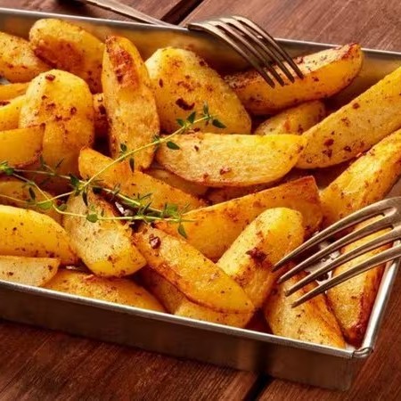 Comida caseira de verdade: Arroz, feijão, macarrão, e batata tipo rústica ou polenta frita.