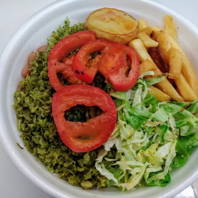 Na marmita Vegana vem: Arroz,feijão branco ou preto,legumes.