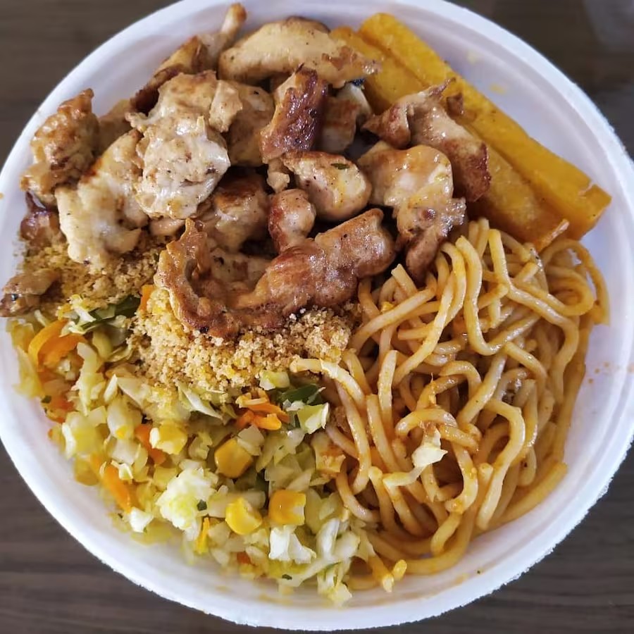 Marmita P - Arroz, batata frita, farofa, bife na chapa, ovo e salada.