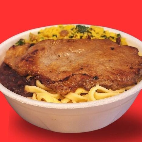 Acompanha arroz soltinho, feijão bem temperado, macarrão simples, farofa crocante e uma salada fresca e nutritiva.