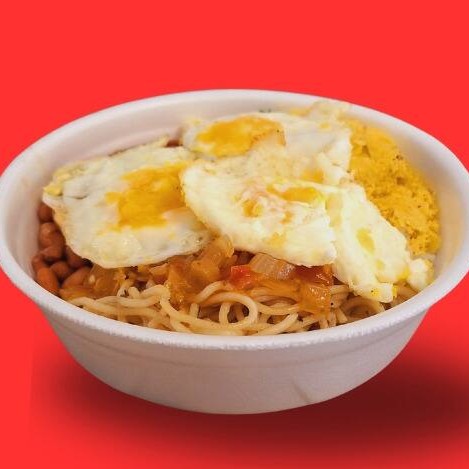 Uma refeição feita com carinho: arroz, feijão, macarrão, farofa, Ovos fritos e uma salada nutritiva. Perfeito para qualquer momento do Dia!