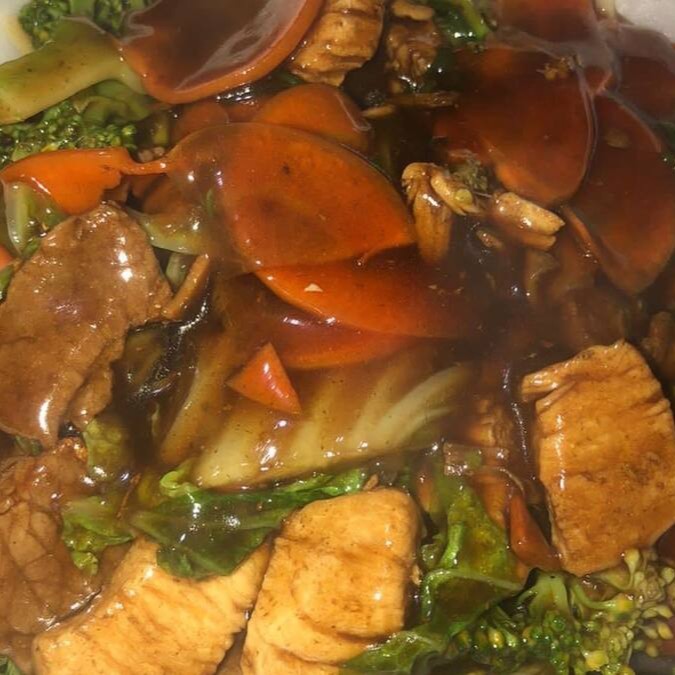 (macarrão de yakisoba, carne, frango e legumes ao molho oriental)