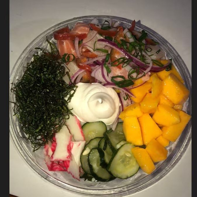 Base de shari(arroz japonês)ceviche misto(tilápia e salmão em cubos com pimentão e cebola roxa),crispy de couve,kani-kama,cebola roxa,sunomono,manga tomate e cream chesse.(acompanha 1 par de hashi 2 saches de molho shoyu) não acompanha tarê.